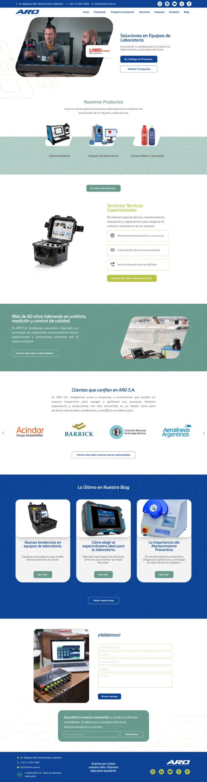 Desarrollo web de arowebsite.com, el sitio institucional de ARO S.A., una empresa con base en Buenos Aires, Argentina, dedicada a proveer soluciones integrales en control de calidad, ensayos analíticos y materiales, ensayos no destructivos, metrología dimensional y sensores industriales para sectores industriales, técnicos y de investigación. El sitio presenta su catálogo de productos, servicios técnicos, soporte postventa, capacitación y contacto comercial en un formato claro y profesional.