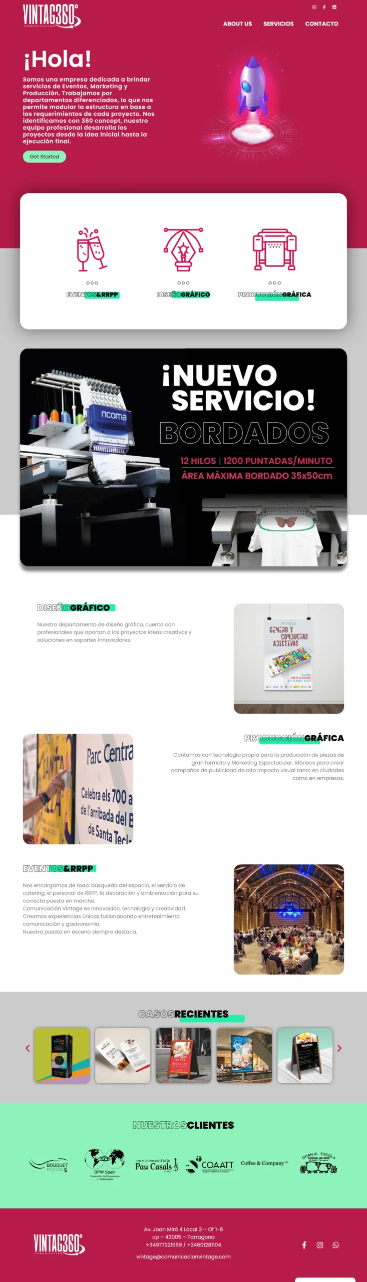 Este es un sitio web corporativo de una agencia de comunicación y marketing ubicada en Tarragona, España, es una plataforma que destaca sus servicios integrales en eventos y RRPP, diseño gráfico, producción gráfica y bordado de camisetas.