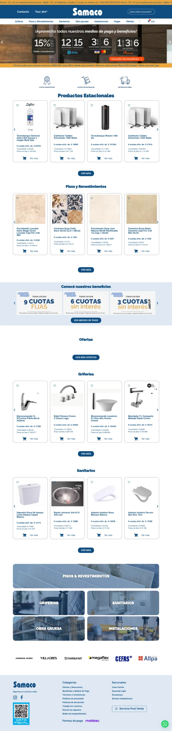 El sitio web samacoonline.com.ar es una tienda online de materiales para la construcción, decoración y mejoras del hogar, desarrollada para centralizar la venta digital de productos como pinturas, pisos y revestimientos, griferías, sanitarios y accesorios. Funciona como el canal ecommerce de Samaco S.A., una empresa con locales físicos en Mendoza, permitiendo extender su alcance comercial al entorno online.