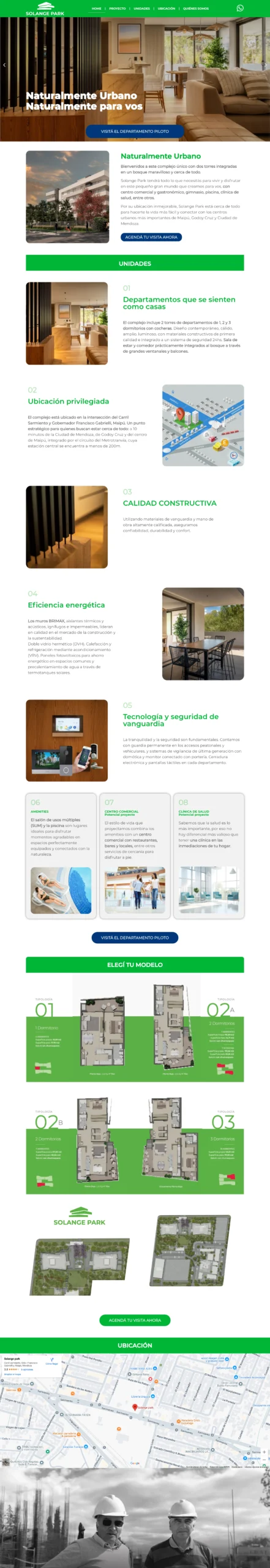 El sitio https://solangepark.com/ es la página oficial del proyecto inmobiliario Solange Park, un complejo residencial y de viviendas ubicado en Maipú, Mendoza (Argentina) que ofrece departamentos y espacios para vivir en contacto con la naturaleza y con excelente conectividad a los centros urbanos de la región. El contenido principal se enfoca en presentar el desarrollo habitacional, destacando departamentos de 1, 2 y 3 dormitorios, diseño moderno, amplios ambientes, balcones con vistas y beneficios de vivir en una zona tranquila cerca de Godoy Cruz y el Metrotranvía.